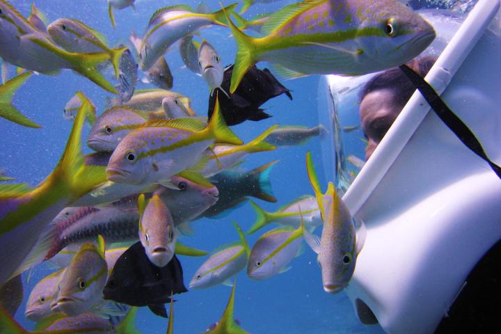 Even non-swimmers and those who don’t snorkel can feed a bevy of colorful tropical fish, view a sunken Jeep and bus, and pose for a photograph while sitting at the underwater Sea Trek Cafe.